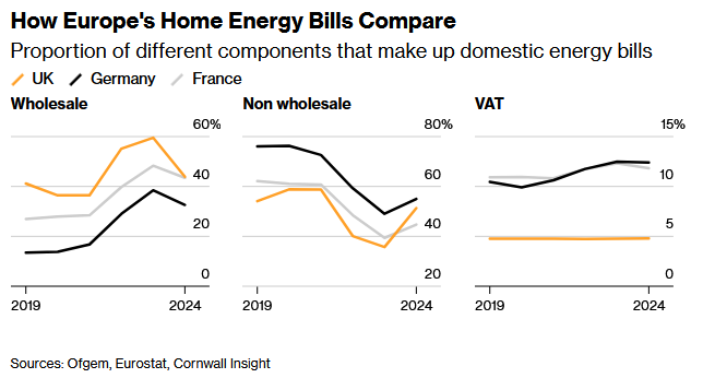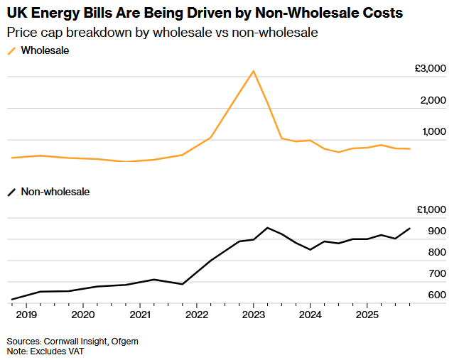 近年数据清晰地展现了能源账单成本结构的剧烈变化。Cornwall Insight的报告显示,自2023年初以来,英国能源账单中批发成本部分已下降约77%,而同期,用于支持政府可再生能源建设的政策成本却上涨了41%。