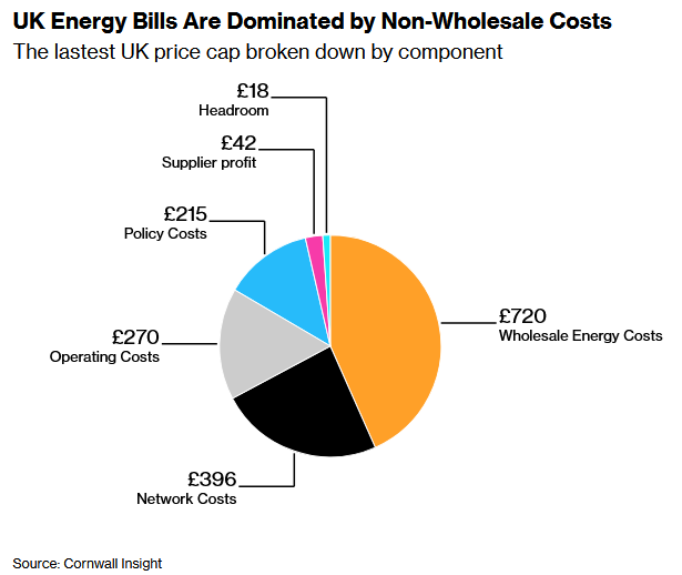 英国部长级官员们承诺,到2030年,风电和太阳能规模的扩张将降低能源费用。但英国最大能源供应商之一Octopus Energy上月向立法者透露,即使批发电力价格腰斩,未来几年能源账单仍可能上涨高达20%,因为其他所有成本都在上升。