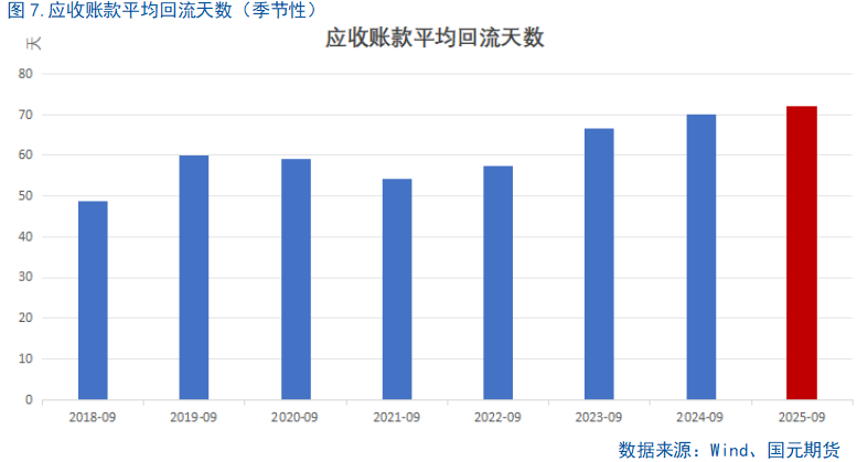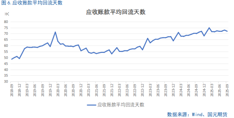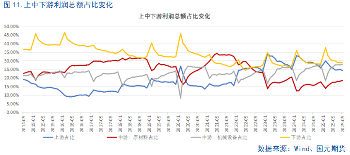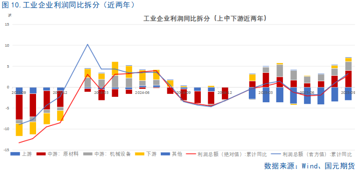 对比营业收入和产成品库存,9月产成品库存名义库存出现反弹,实际库存增速尚未见反弹但环比跌幅已经出现收窄迹象。9月伴随着出口增速的明显回升以及PPI的小幅改善,企业生产意愿虽然仍然偏谨慎,但出现边际增强,生产与销售呈现紧平衡状态相互牵制,逐渐出现主动补库的迹象。营收账款平均回收天数虽然同比仍在增加,但是环比出现减少,且环比降幅高于季节性,企业压降费用对冲了部分成本上行带来的压力,应收账款周转出现改善。划分上中下游产业链来看,反内卷政策对上游及中游利润的改善更加明显,上游及中游装备制造业的当月利润同比出现大幅上行,与此同时,下游消费品制造业当月利润同比涨幅相对缓慢。
