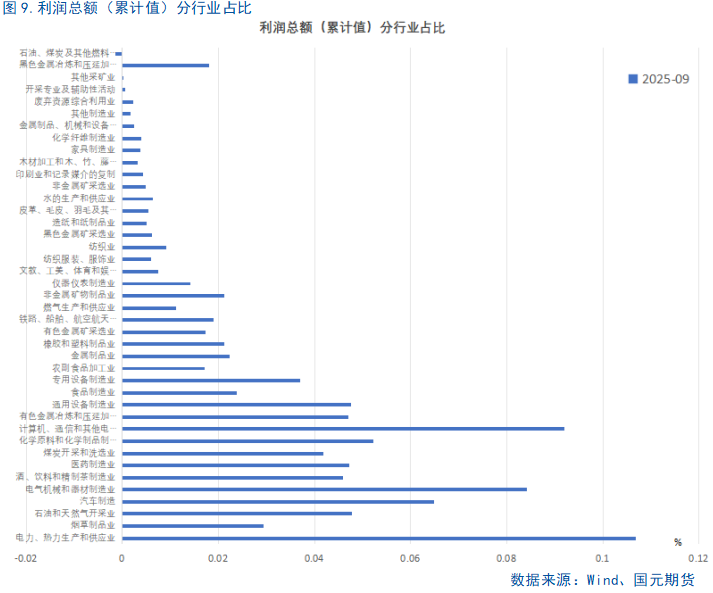 从整体来看,2025年9月份的规模以上工业企业利润累计同比增速为3.2%,较上个月出现明显回升。本月工业企业利润增速出现明显改善的原因一方面是由于去年的低基数的影响。去年9月利润当月同比下跌27.1%。另一方面工业生产的显著上行也是利润改善的主因之一。区分量、价、率三方面来看,9月份工业企业利润整体呈现“量价齐升、利润率改善”的显著特征。量方面,高温多雨天气有所改善,叠加非美地区出口的支撑,企业生产活动稍有加速。价格方面,“反内卷”政策效果逐步显现,叠加去年高技术影响消退,PPI同比降幅有所收窄,结束了前期持续下跌的局面。而利润率方面,工业企业利润率较前期有所提高,整体来看三者均出现积极改善。从行业来看,制造业企业对工业企业利润回升的贡献较大,原材料、装备制造业利润明显改善,采矿业以及电热燃气及水生产供应业利润率较8月有所回落。